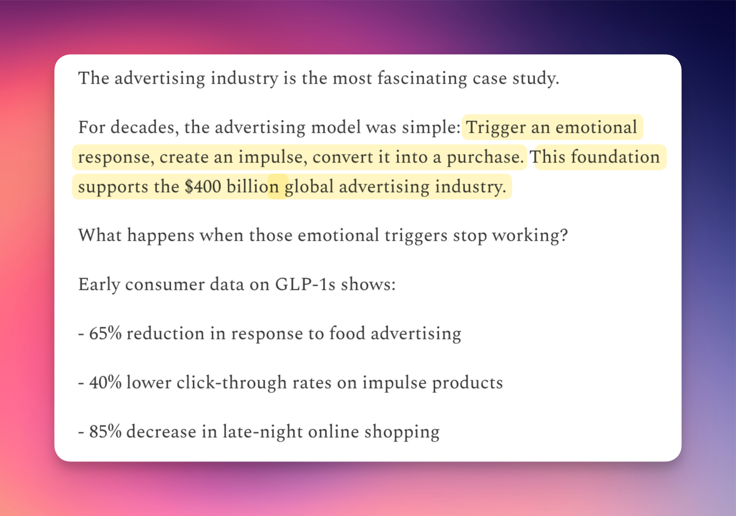 .I won’t go into a bunch of detail about the medication and the impact it’s already having from an economic standpoint (it’s all in the article), but let’s talk about what this means for the marketers who rely on a lack of impulse control to sell to people.