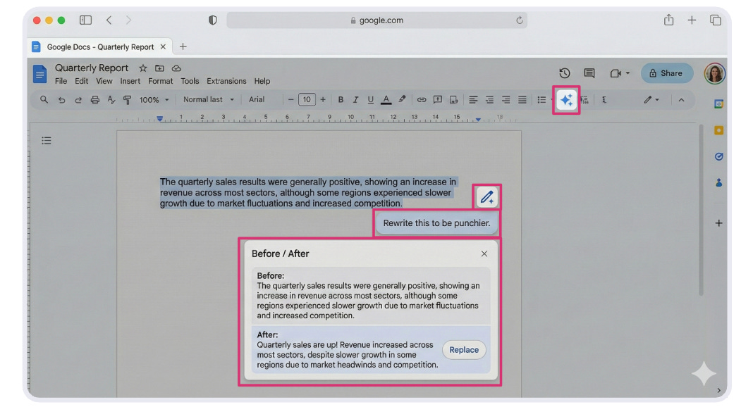 The Workflow: Highlight a paragraph that feels clunky. Click the Gemini pencil icon. Don’t just ask it to rewrite; give it specific instructions.